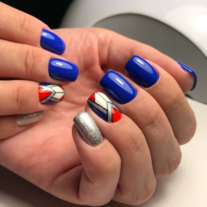 Красно-синий маникюр. Такой дуэт применяется в маникюрных техниках нечасто, поскольку признается слишком ярким и вычурным. Но добавление светлых оттенков поможет сгладить сочность красок, разбавить их броскость.