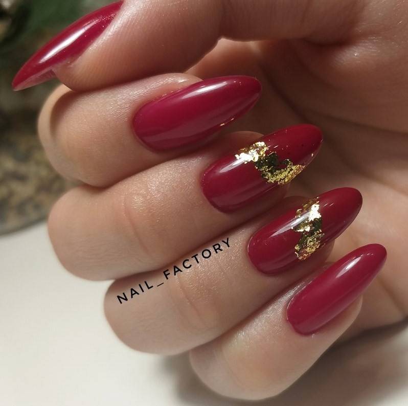 Следующее оформление ногтей подойдёт неординарной личности, желающей выделиться из общей серой массы. В качестве основного выбран красный цвет, отдельные акценты выполнены при помощи техники с фольгой. На указательном и безымянном ногтях зелёное, синее и золотое покрытия сливаются в единое блестящее пятно.