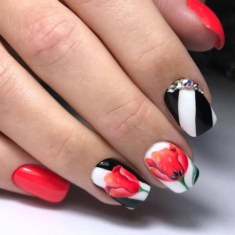 Строгость, консервативность, магнетизм черного цвета удачно сочетается со страстной энергетикой красного. В зависимости от концепции дизайна можно создавать композиции, которые выглядят красочно, сочно, колоритно. Либо, напротив, маникюр может смотреться сдержанно, элегантно, если, к примеру, сделан на прозрачной основе.