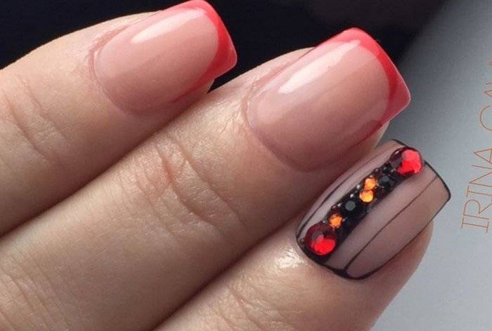 Классический френч в бежево-красном исполнении на пластинках средней длины смотрится необычно и изысканно, а акцент из чёрного обрамления, вертикальных полос и разноцветных страз на безымянном ногте позволят добавить вечернему образу оригинальности и некоторой дерзости.