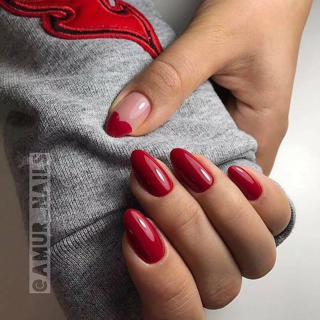 Красивые красные ногти с нюдом. Выбирать нежные нюдовые оттенки стоит для офисного или романтичного маникюра. Они помогают приглушить яркость красной основы, придают дизайну более скромный, нейтральный вид.