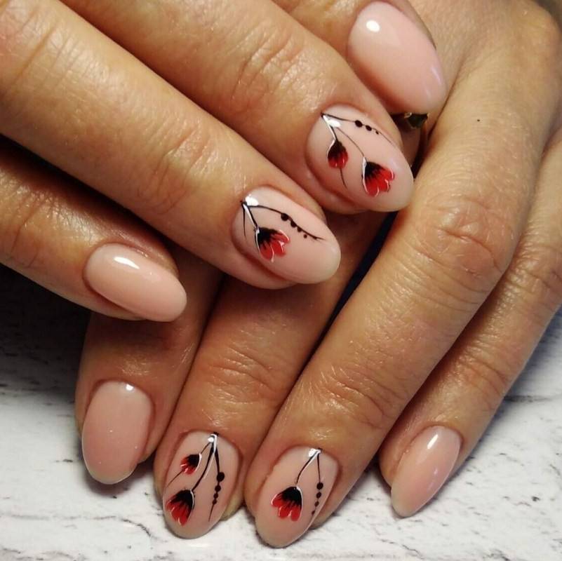 Среди романтичных натур популярны рисунки цветов, сердечек и бабочек. Лучше всего такие рисунки смотрятся на белой, молочной или нюдового цвета основе. Очень элегантно и романтично смотрятся рисунки роз, тюльпанов, маков и различных других красивых цветов.