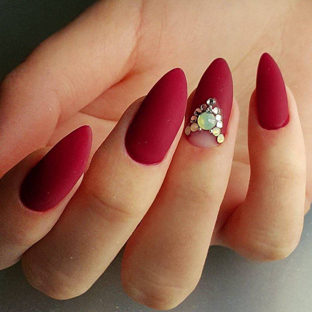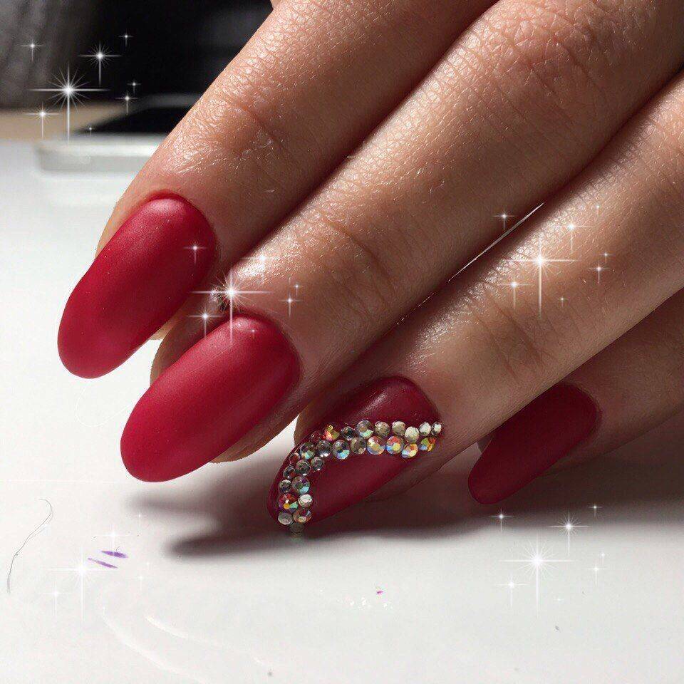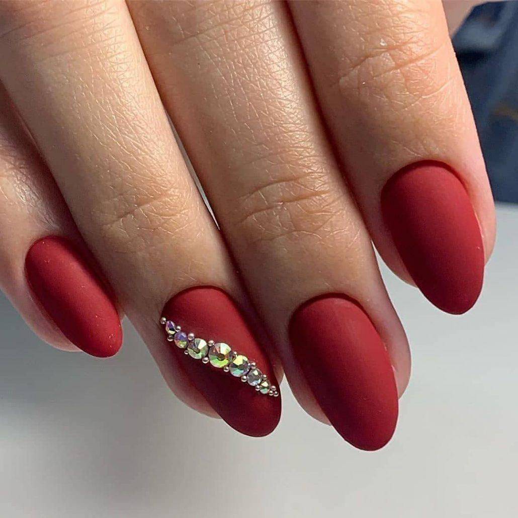 Наращенные или натуральные длинные ногти с классическим красным лаком – это самый эффектный, но все же скучный маникюр. Попробуйте матовый дизайн с блестящим декором, жемчугом. Чтобы не ошибиться, выбирайте темные оттенки красного — так маникюр не будет выглядеть аляповато.