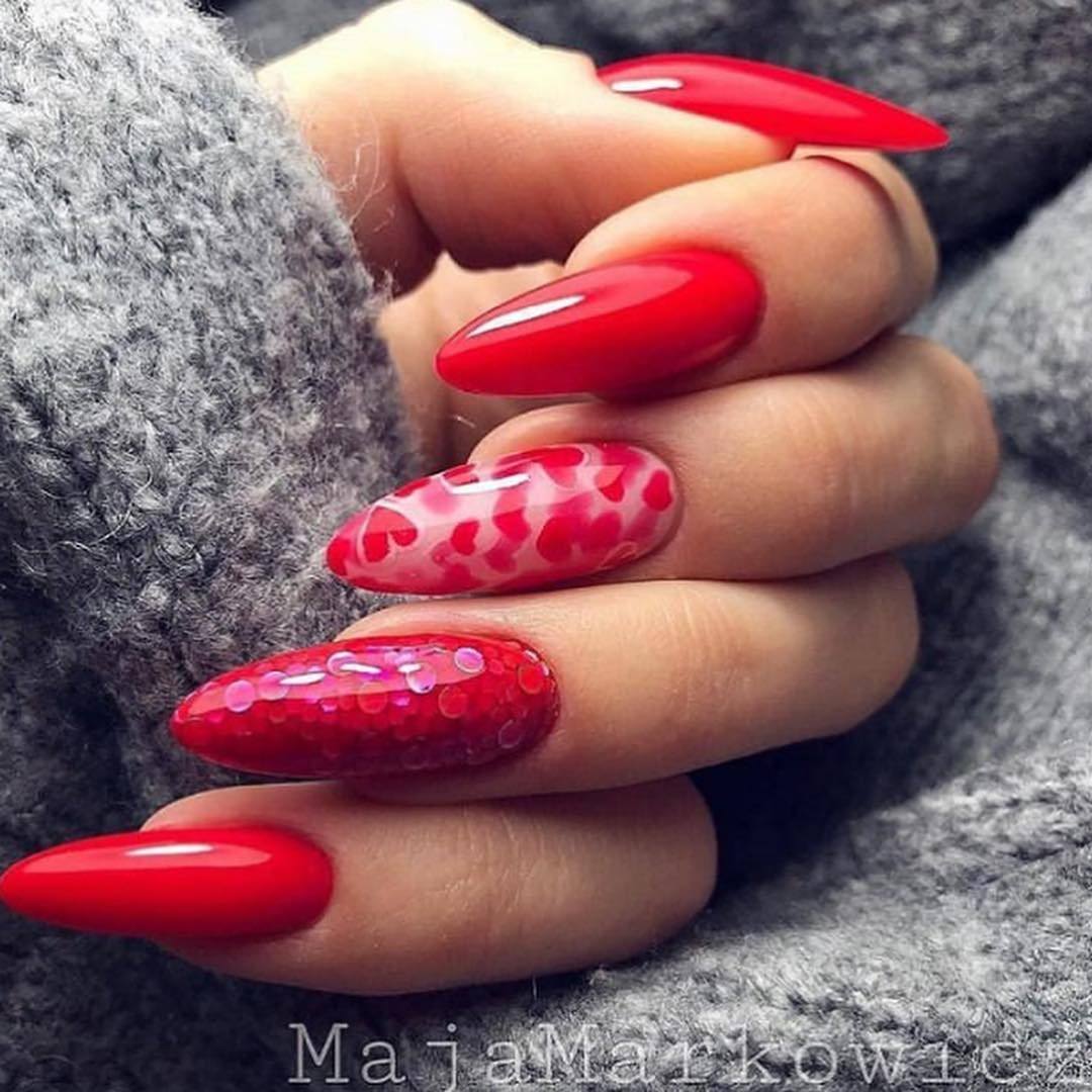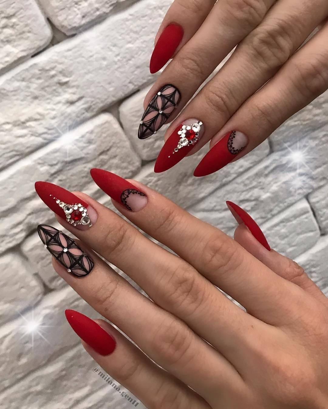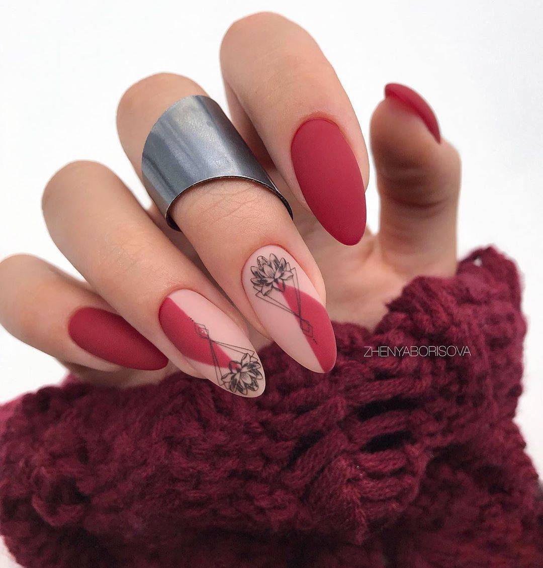 Наращенные или натуральные длинные ногти с классическим красным лаком – это самый эффектный, но все же скучный маникюр. Попробуйте матовый дизайн с блестящим декором, жемчугом. Чтобы не ошибиться, выбирайте темные оттенки красного — так маникюр не будет выглядеть аляповато.