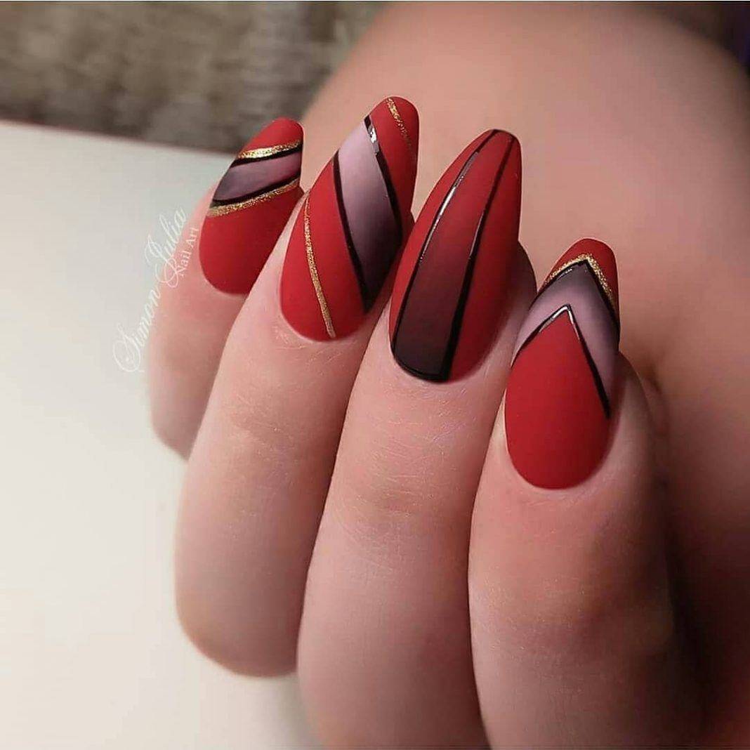Геометрия в черно-красном альянсе. Маникюр алого цвета с глянцевыми геометрическими полосами смотрится очень достойно и стильно. Можно расположить их хаотично, выстроить в одну сторону или же сделать красивый рисунок с помощью прямых линий – как душа того пожелает. Отличным помощником в создании геометрических узоров станет также модный в этом сезоне гель-паутинка, он сделает линии идеально ровными и четкими.