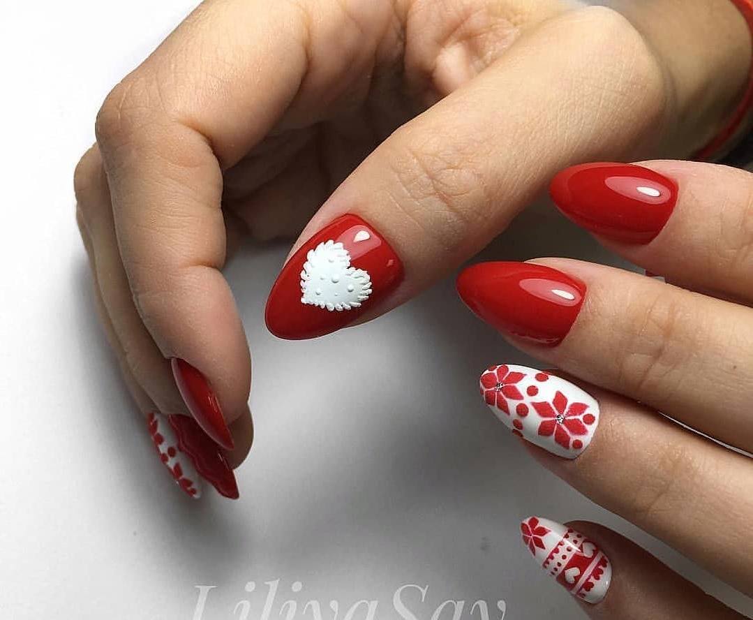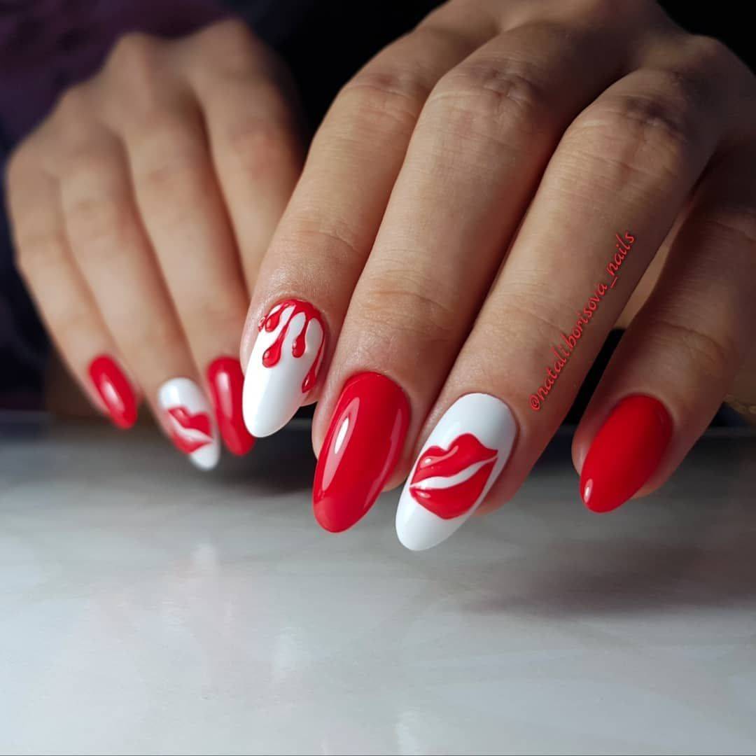 Белым гель-лаком можно изобразить абсолютно любой узор, акцентировать внимание на отдельных ноготках. Самый простой и при этом стильный вариант – поочередное окрашивание ногтей красным и белым цветом