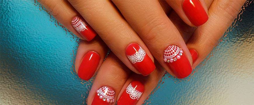 Шеллак красный с белым. Такое сочетание является наиболее востребованным и привлекательным. Белым цветом можно выполнить кружевной узор на яркой основе, сделать френч, нарисовать цветок или другое изображение.