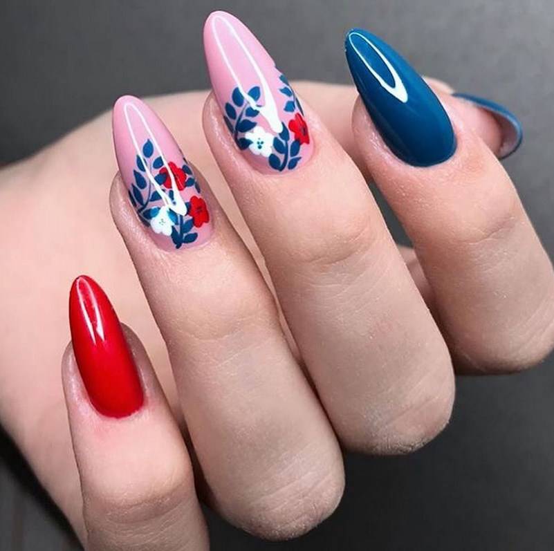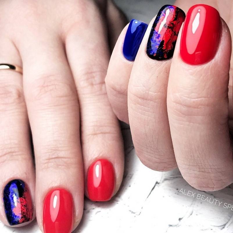 Красно-синий маникюр. Такой дуэт применяется в маникюрных техниках нечасто, поскольку признается слишком ярким и вычурным. Но добавление светлых оттенков поможет сгладить сочность красок, разбавить их броскость.