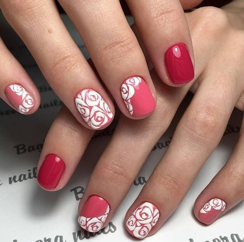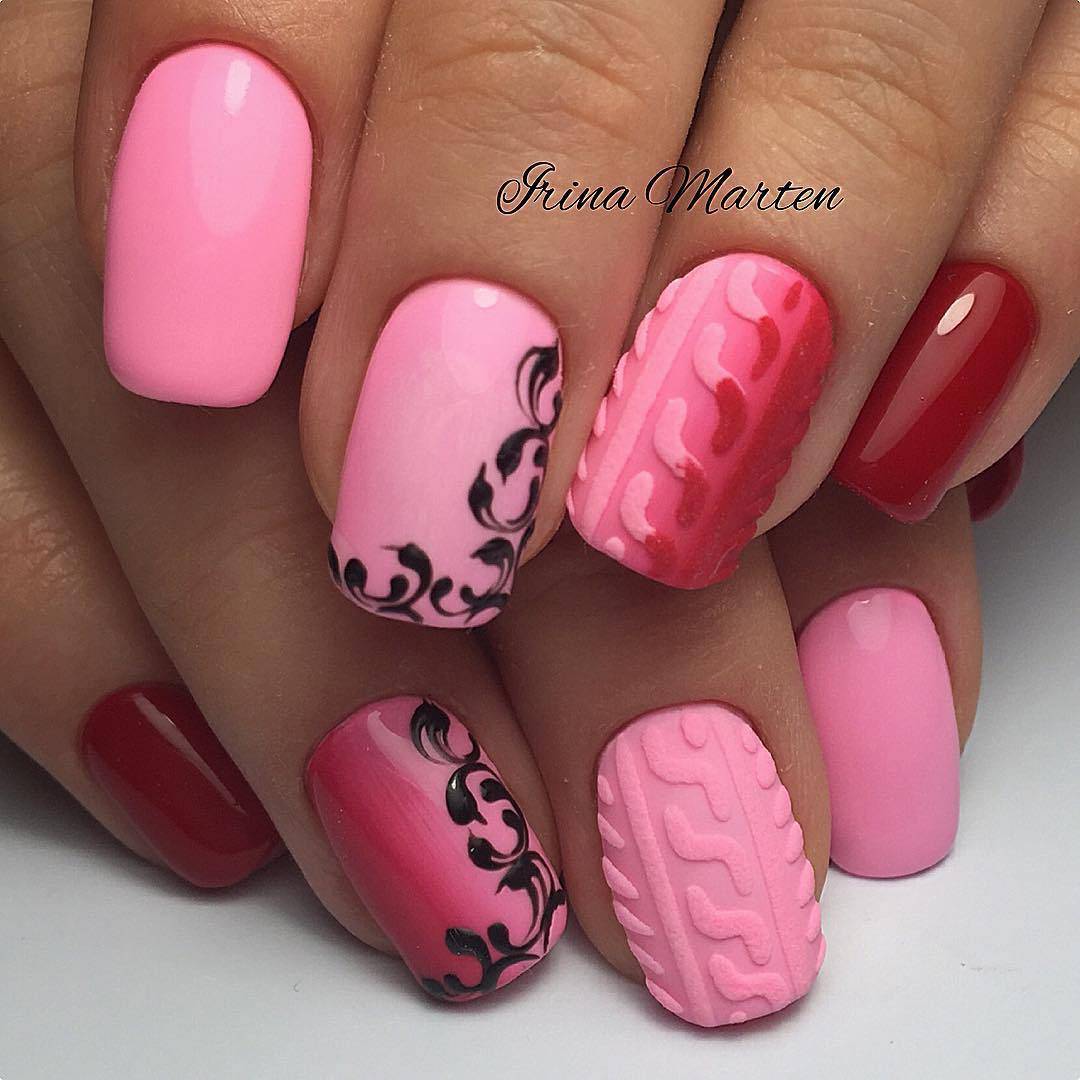 Красно-розовый маникюр. Для этой комбинации идеальна техника омбре или градиента. Переход от красных оттенков к нежным розовым даёт потрясающий зрительный эффект, настраивает на романтический лад. Темные тона лучше располагать ближе к основанию ноготка, светлые – на кончиках.