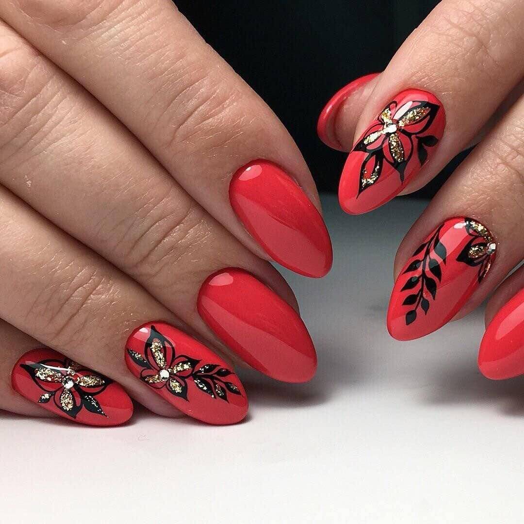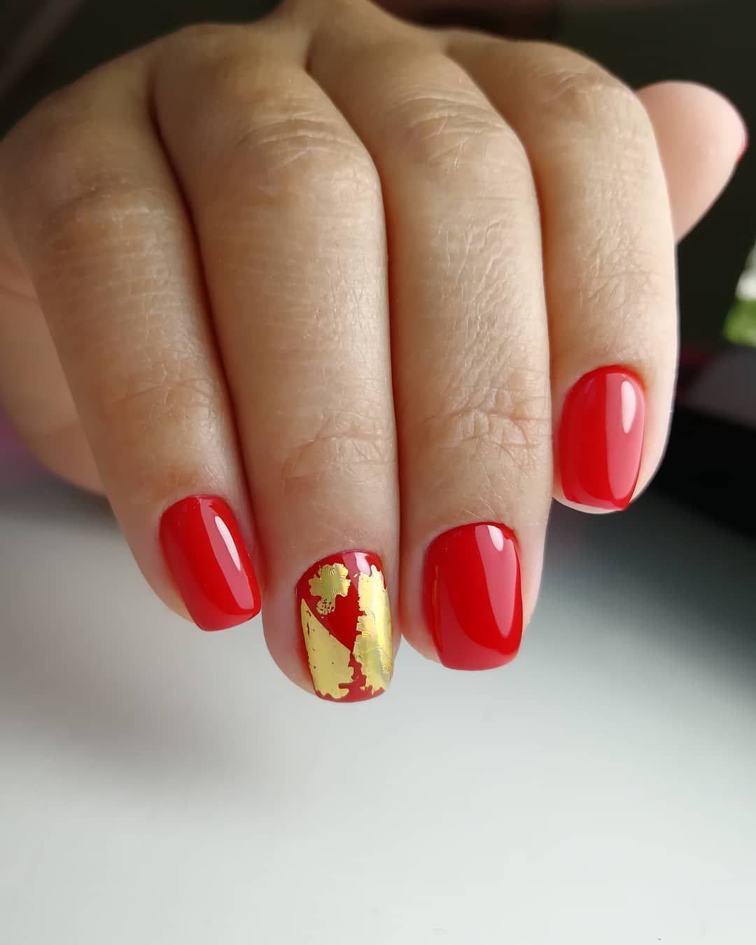 Королевское сочетание красного цвета на ногтях с золотыми декоративными элементами или покрытием смотрится роскошно. Блестящим акцентом может быть орнамент или всевозможные узоры на алом фоне.