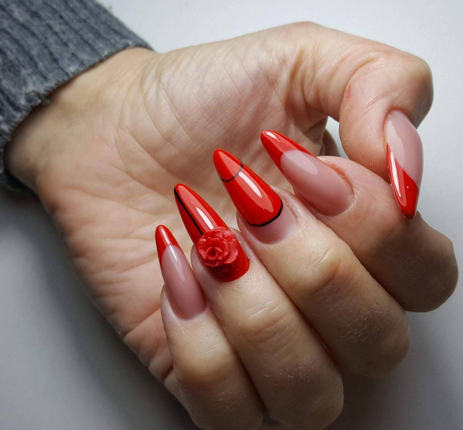 Маникюр с красным цветом необязательно должен быть монохромным. Идеи применения яркого лака разнообразны: