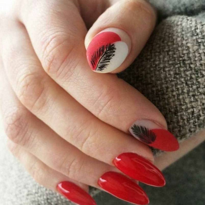 Вторым по-популярности, в этом сезоне является красный маникюр с различными рисунками. Это самое востребованное и желанное сочетание — вне моды и времени. Как мы знаем, красные ноготки любит большая часть прекрасной половины человечества, и рисунки на ноготках предпочитает не меньшее их количество.