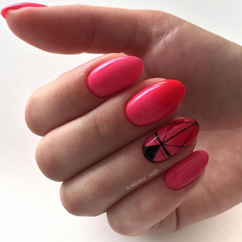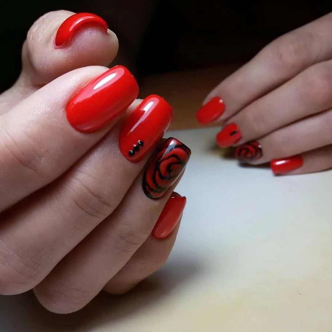 Красные ноготки в сочетании с чёрным. Комбинация этих двух тонов считается неизменной классикой. Чёрный будет служить акцентным цветом, поэтому им лучше делать рисунки, полоски, абстрактные линии на красном. В оформлении допустимы стразы, блёстки.