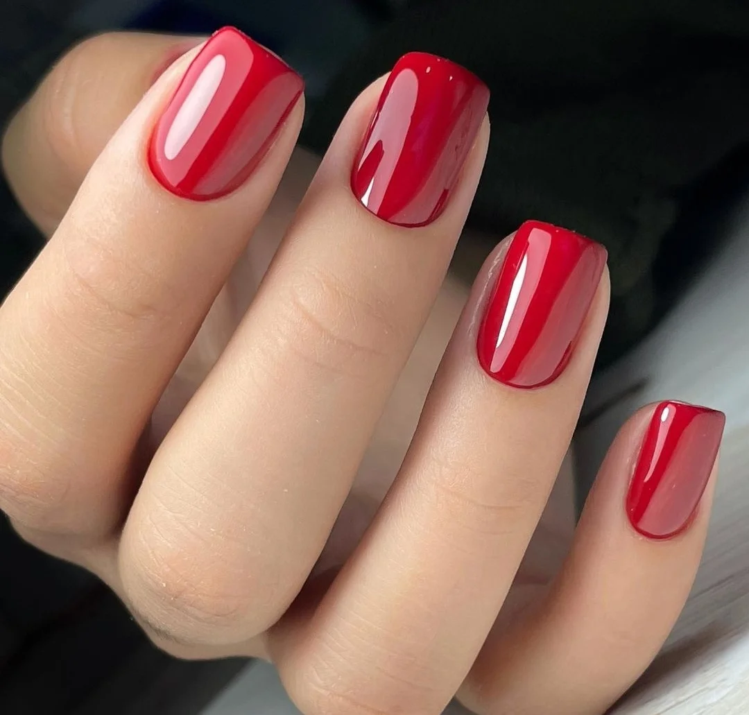 Для повседневных выходов отлично подойдёт классический глянцевый маникюр, выполненный в красном цвете. Он прекрасно впишется в любой образ: будь то строгий офисный костюм или маленькое чёрное платье.