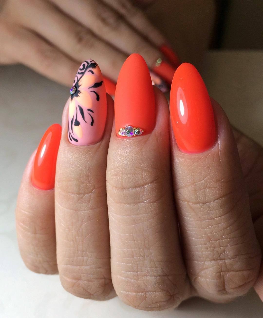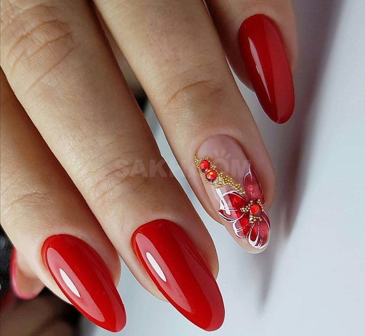 Длинные ногти, покрытые красным лаком, смотрятся особенно эффектно. По цветовой гамме можно выбрать как классические красные оттенки, так и яркие цвета вроде оранжевого, розового, бордового и т.д.