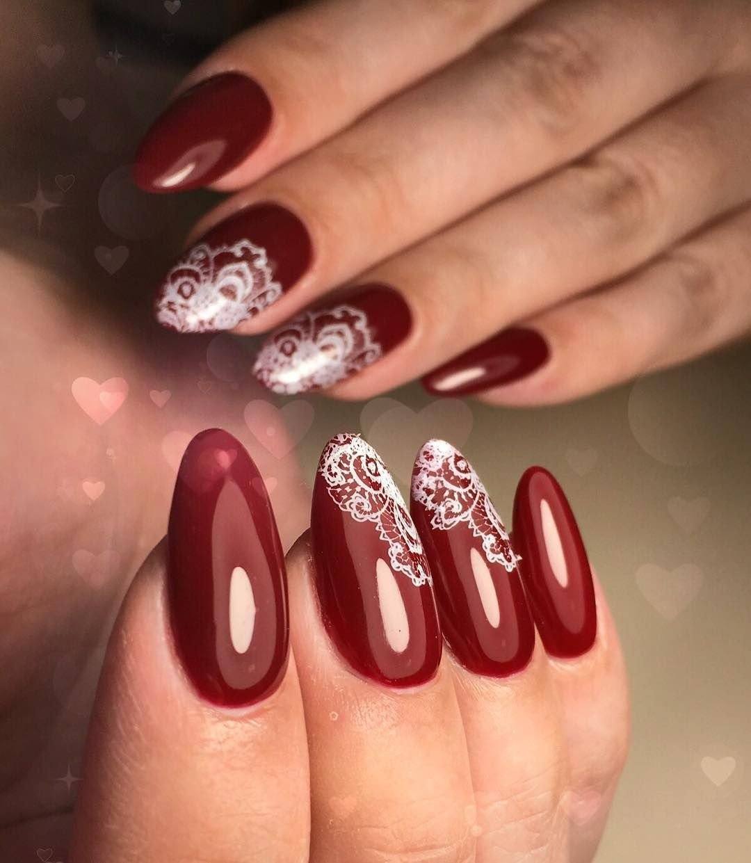 Вуаль или кружево черного цвета на одном или нескольких ногтях эффектно украсит ваш маникюр. Для ее создания необходимо тонкой кистью прорисовывать ногтевую пластину с каждого края. И дальше фантазировать, придумывая узоры в виде ажурного рисунка. Остальные ногти можно покрыть обычным глянцем красного цвета. Такое решение сделает пальчики очень изящными.