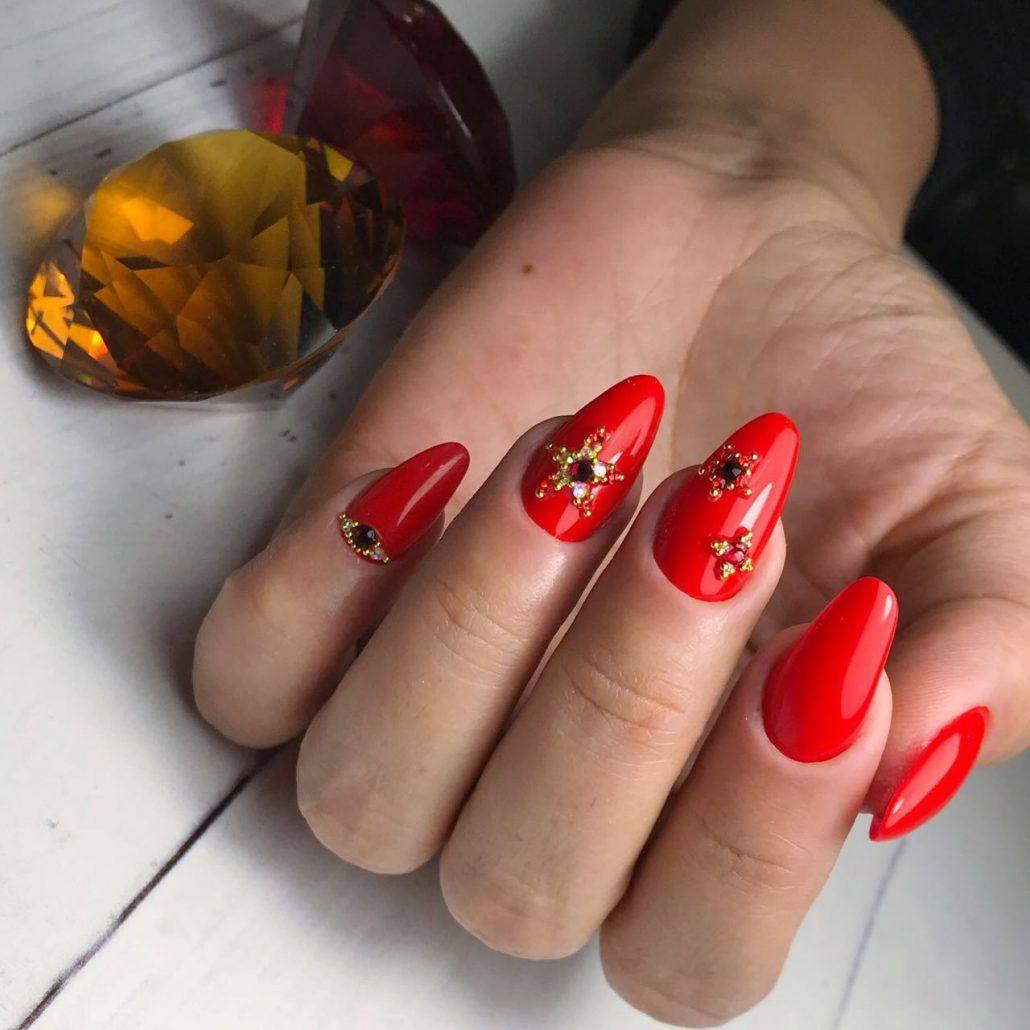 Если вы желаете сделать ваш маникюр более роскошным, то используйте с красным лаком стразы. Маленькие камешки на алых ноготках выглядят очаровательно. Кстати, благодаря прочности гель-лака, стразы не отпадут.