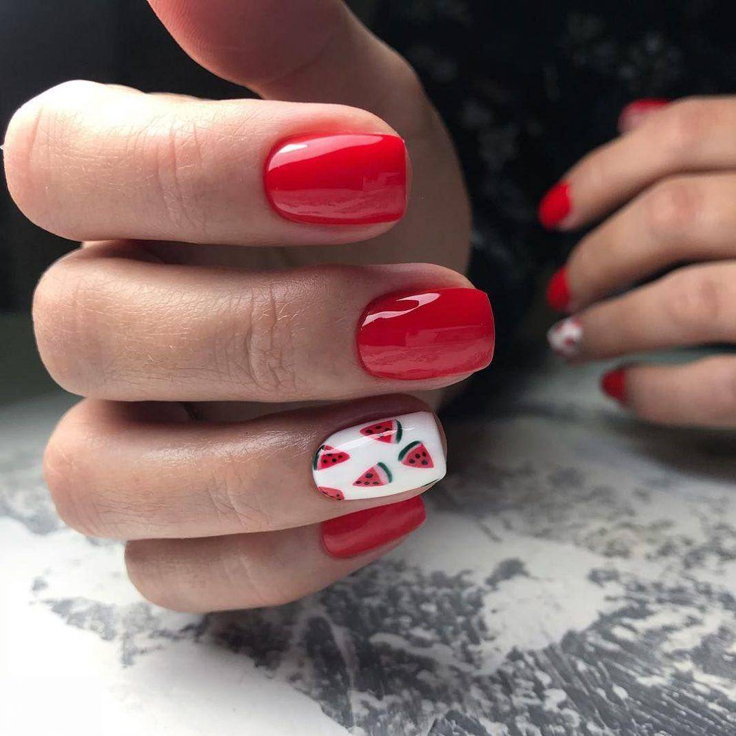 Очень красиво и оригинально смотрятся рисунки фруктов и ягод в сочетании с красным дизайном. Но, такой вариант дизайна более подойдет для летнего маникюра.