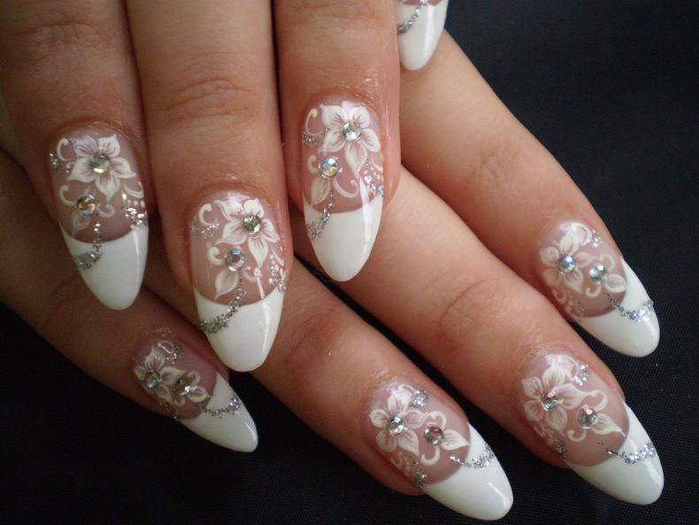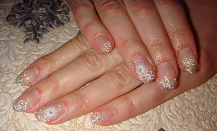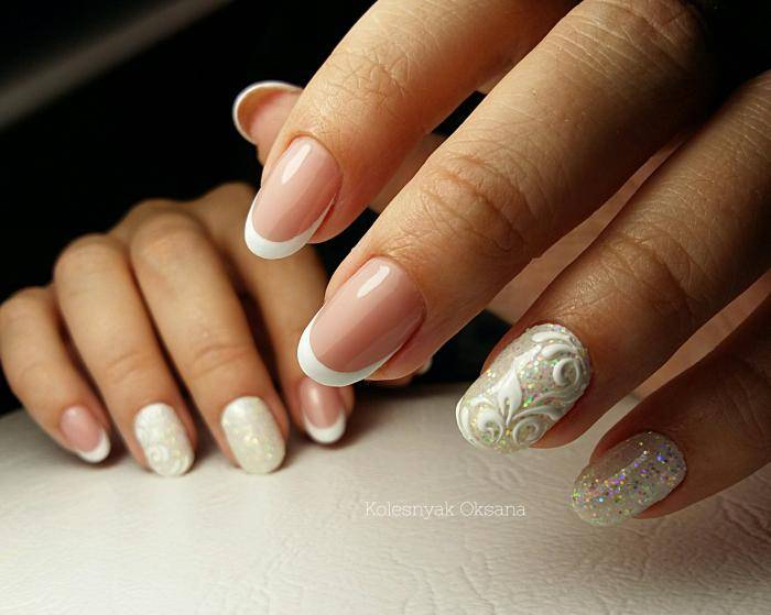 Самый популярный свадебный дизайн ногтей – это французский маникюр – аристократичный и сдержанный, специально для свадебного торжества может быть украшен стразами, блестками, фольгой. Это, пожалуй, тот единственный случай, когда французский маникюр не универсален и не подойдет под любую одежду. Длина ногтей не имеет большого значение, небольшой выход края ногтя (3-4 мм) дает возможность создать красивый дизайн свадебного маникюра.