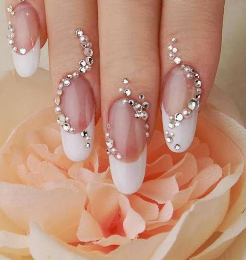 Эти великолепные свадебные ногти – новый взгляд на французский маникюр. Вместо жесткой линии между белыми кончиками и розовой основой, эти свадебные ногти стирают линию перехода от розового к белому. Этот маникюр будет хорошо смотреться на любой длине ногтей.