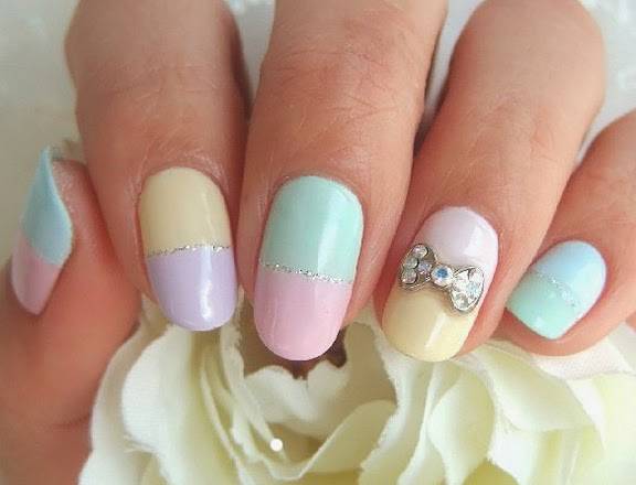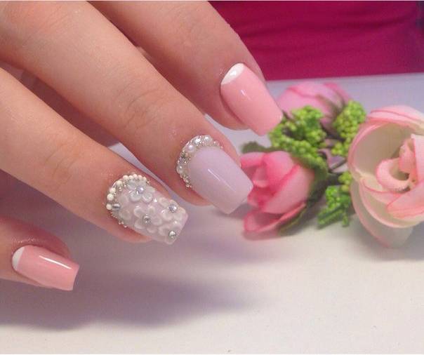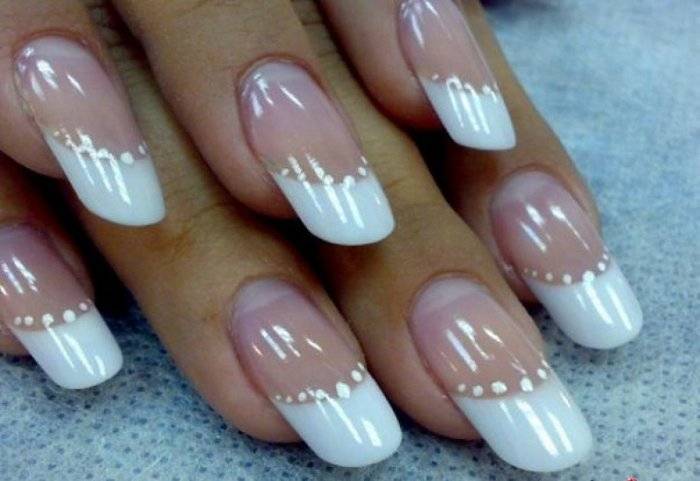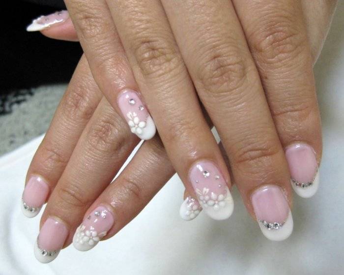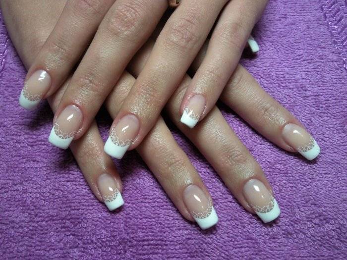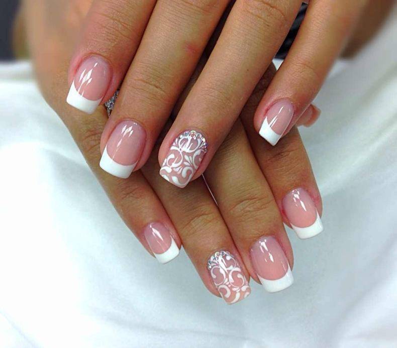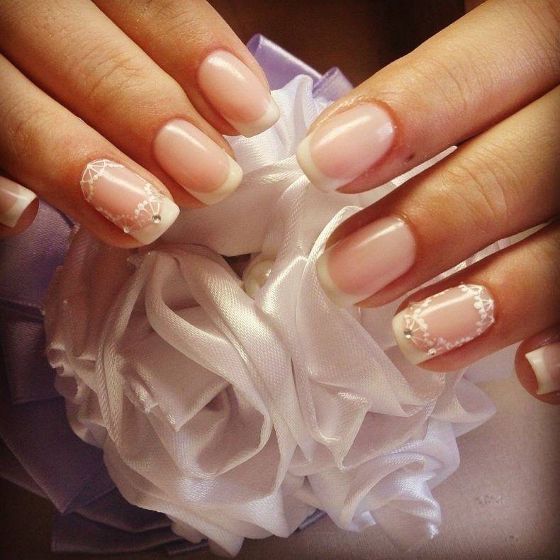 Такой дизайн, как френч, следует наносить на основу пастельного цвета, украшениями френча должны являться стразы, кружев и другие рисунки при необходимости.