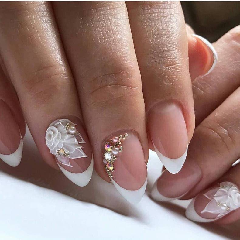 Несколько оригинальных вариантов дизайна свадебного миндального маникюра стали очень популярными и востребованными в этом году. Классический френч на миндальной форме особенно хорош и самодостаточен.