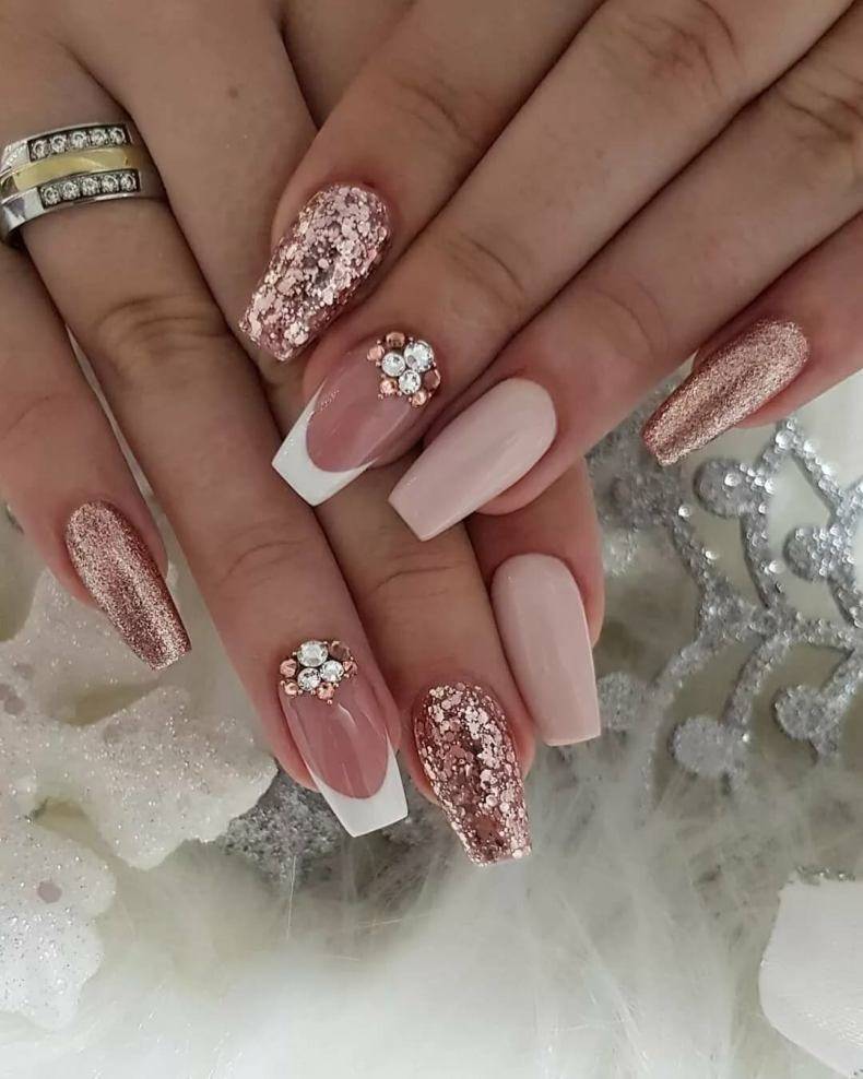Но если уж сиять, то так, чтобы все взгляды были устремлены на невесту. В этом дизайн для ногтей в стиле незаменим! Яркий незабываемый нюдовый тон на свадьбу в купе с блистающим сиянием – вот что станет красивым решением для маникюра невесты. Глиттер как волшебная пыльца украшает ноготь, будь то косметический, декоративный или пудровый эффект – все они ослепительны. А вот чтобы блестки ногтей не отвлекали от красоты самой невесты, можно чередовать покрытие глиттер с однотонным нюдовым тоном.