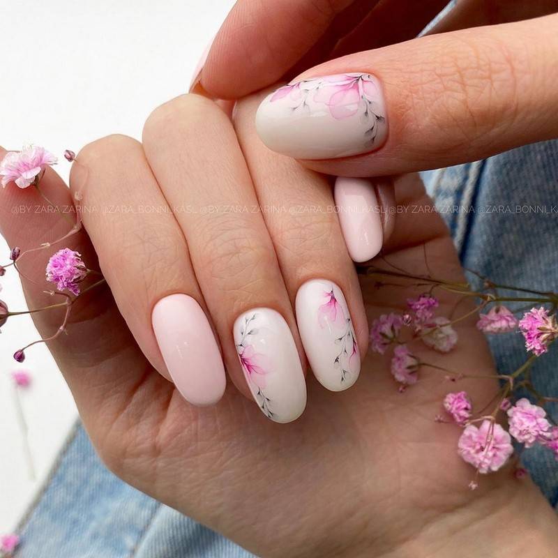 Тренд сезона — однотонное покрытие в сочетании с прозрачной базой, на которую нанесен рисунок — нежные цветы, кружево или обычные фольгированные полоски. Отлично смотрится и лунный маникюр с минималистичным выделением небольшими камнями.