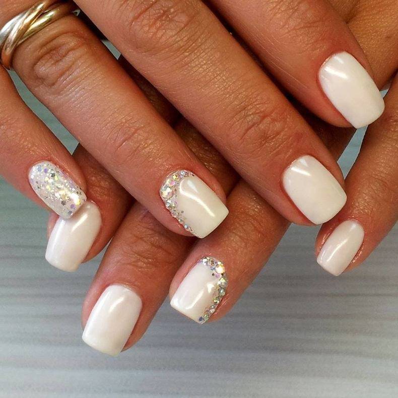 Конечно, короткая форма ногтей несколько ограничивает невесту в выборе дизайна. Традиционными для свадьбы считаются дизайны — френч, однотонное покрытие или омбре. А вот в качестве декора чаще всего невесты выбирают стразы, втирку или блестки.