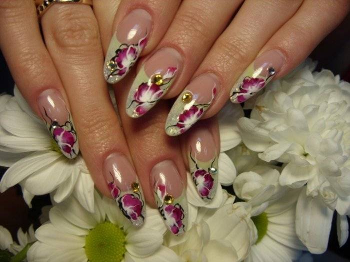 Острая форма ногтей сама по себе привлекает много внимания. Нейл-стилисты советуют оформить ее как можно проще — нюдовая база с выделением одного или двух ногтей. В качестве декора можно выбрать традиционные стразы, втирку, рисунки.