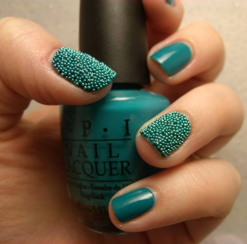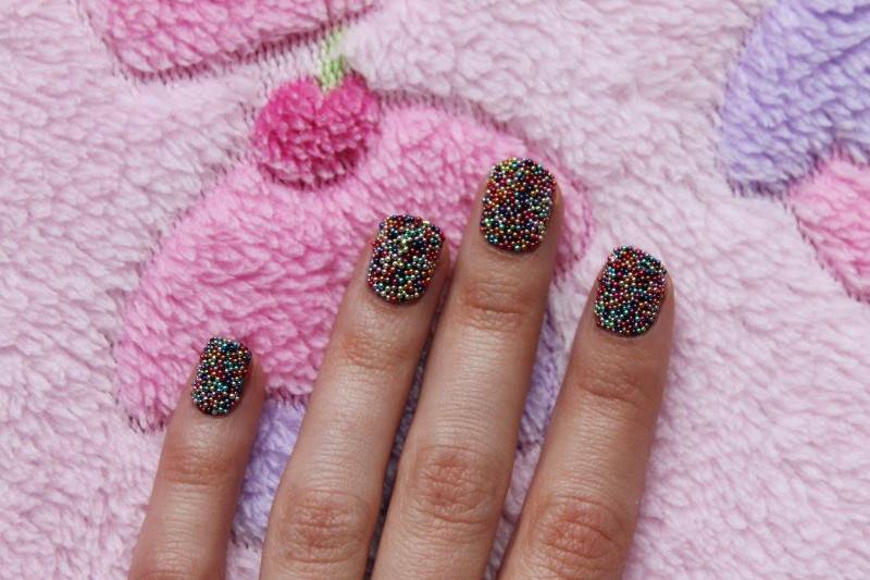Такой дизайн никого не оставит равнодушным. Для создания икорного маникюра потребуется лак-основа или база и специальный микробисер, который в большом ассортименте представлен в маникюрных магазинчиках.
