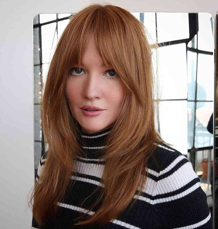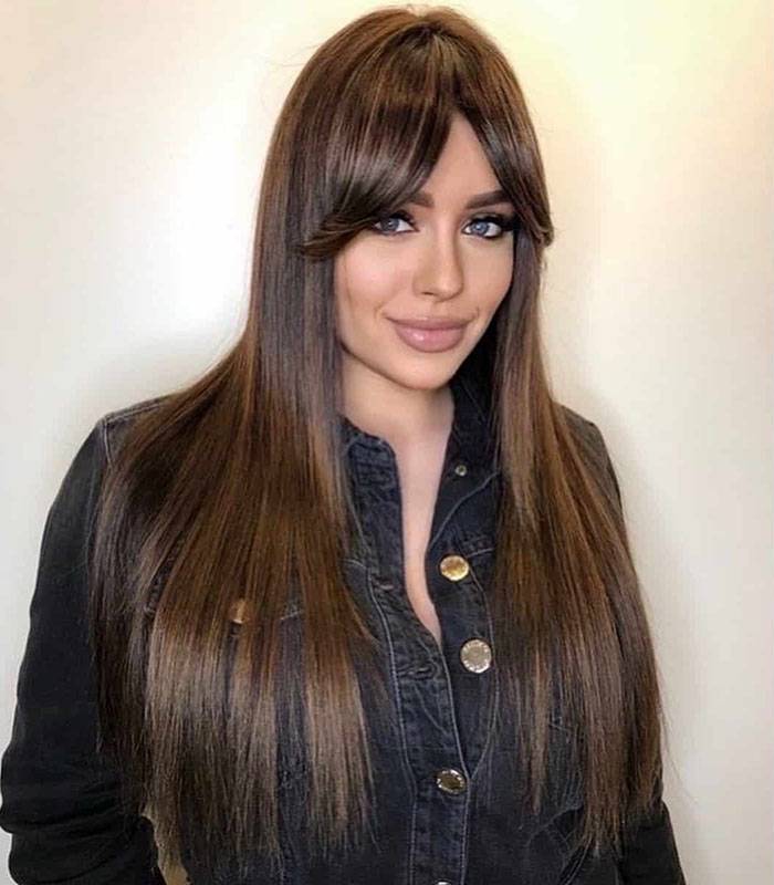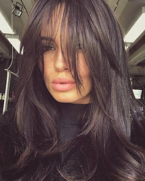 Прекрасный выбор для поклонниц челок и длинных волос даже из мира звезд. Стрижки с челкой на два бока выглядят великолепно и добавляют образам особое очарование, загадочность и романтику.