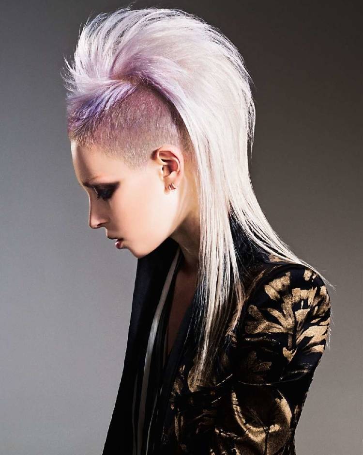 - трафарет: краской на прядях делают определённый рисунок по трафарету, выглядит очень необычно, идеально подходит для коротких стрижек и на выбритых участках головы.