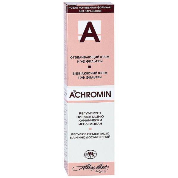 «Achromin» – это средство, которое относится к ряду лечебной косметики, направленной на удаление пигментации на коже. Разработан данный косметический продукт болгарскими дерматологами и косметологами, выпускается в 2 формах: в виде крема и мази. Благодаря своим компонентам, этот косметический продукт успешно борется с пигментацией различной этиологии (происхождения).