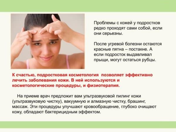 При наличии новообразований на лице мальчиков или девочек подростков – угрей и прыщей, уход должен состоять также и с лечения. Хорошо себя зарекомендовали аптечные средства на основе салициловой кислоты. Она глубоко проникает в кожу, удаляет избыток жира, нормализует работу сальных желез и убивает бактерии, провоцирующие образование таких дефектов.