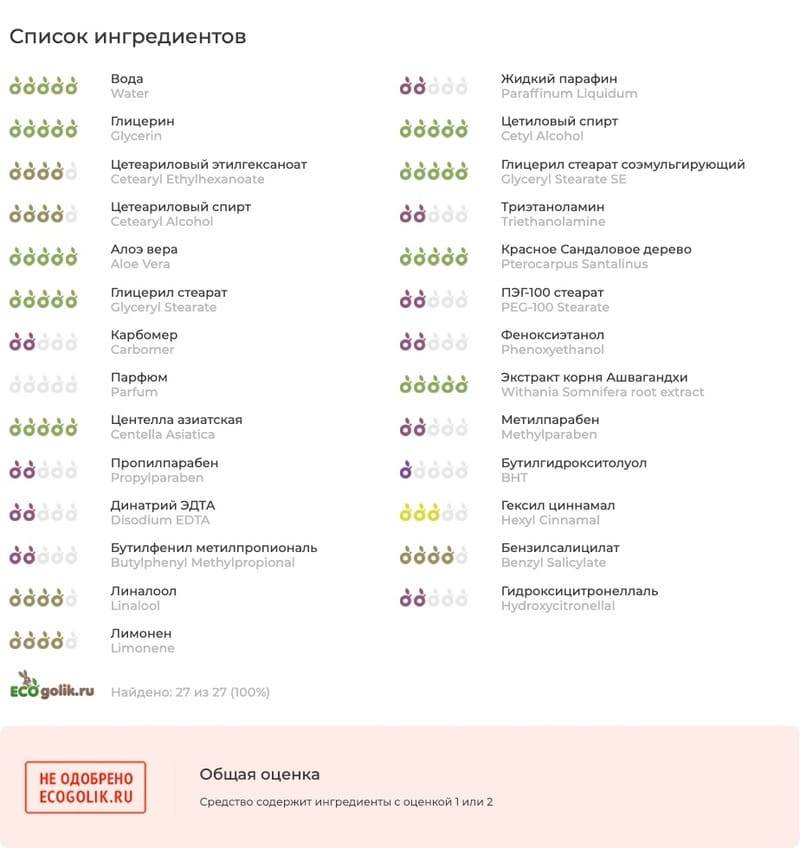 По сравнению с другим кремом от фирмы Гималая в этом значительно больше консервантов и веществ способных оказать отрицательное влияние на кожу. Именно они помечены маленьким количеством яблочек в анализе от экоголик.