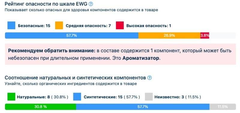 На первый взгляд, состав вроде как неплохой. Однако я не могла не сделать его более подробный анализ и проверить его на безопасность и натуральность при помощи анализаторов косметических средств.