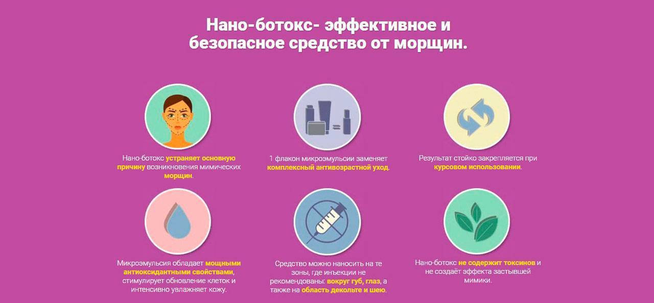 Изготовитель заявляет, что микроэмульсия Нано Ботокс работает в двух направлениях. Сыворотка дает эффект омоложения, и одновременно предохраняет кожу от появления новых морщинок. Компания-изготовитель гарантирует видимый результат от Нано Ботокс для лица по прошествии месяца.