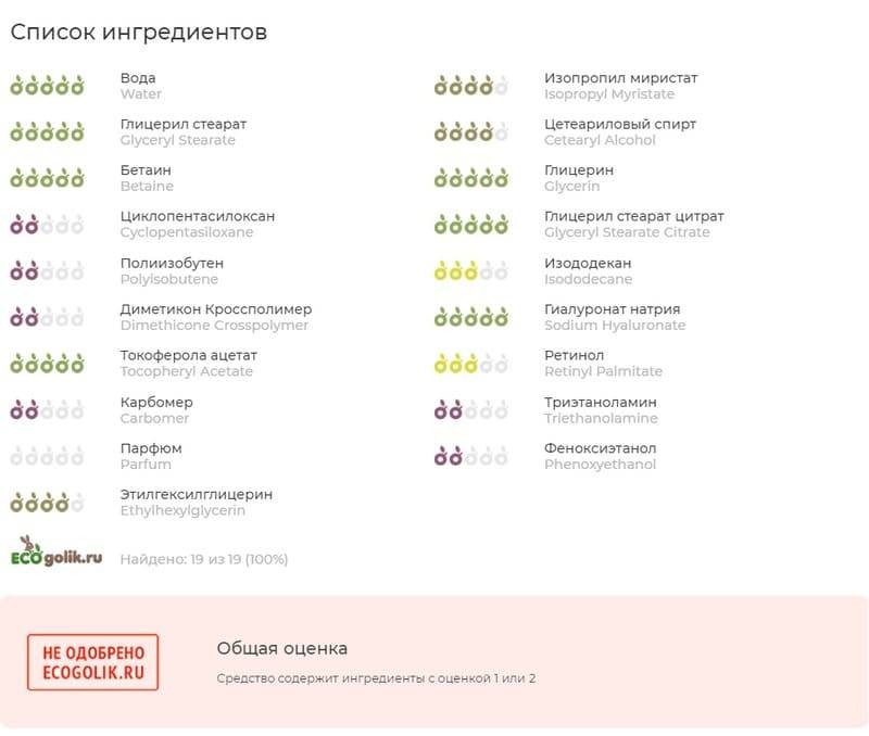 Больше половины компонентов, а именно 11 из 19 обладают хорошим рейтингом. Для недорого крема — это очень неплохой показатель.