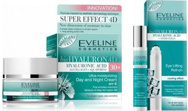 - следующим в списке стоит польский крем известного производителя Eveline под названием «Вio HYALURON 4D». Преимуществами этого средства являются большое количество ГК в составе, вполне доступная для каждой женщины стоимость, а также ярко выраженный, заметный с первых дней применения освежающий и обновляющий кожу эффект;