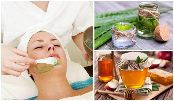 - Медовая с алоэ. Смешать жидкий мед (если в наличии только густой продукт, то его нужно подогреть) и пюре из мякоти листьев алоэ в пропорции один к одному. Накладывать смесь на лицо на двадцать минут.
