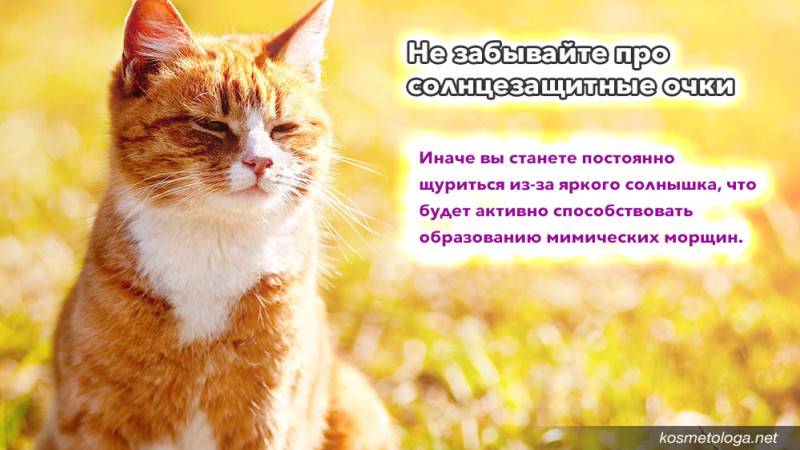 А также не забывайте в солнечный день использовать солнцезащитные очки. Потому что если вы будете постоянно щуриться от яркого солнечного света – это будет весьма существенно способствовать появлению мимических морщин.