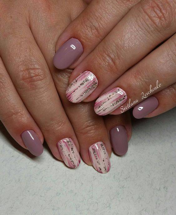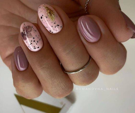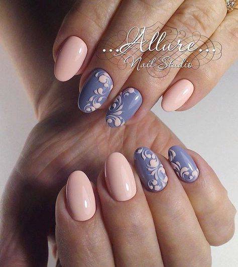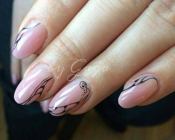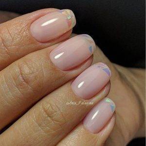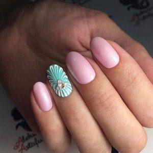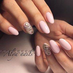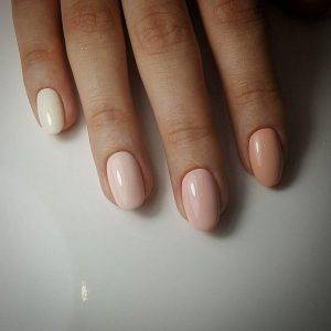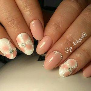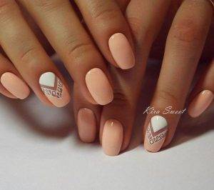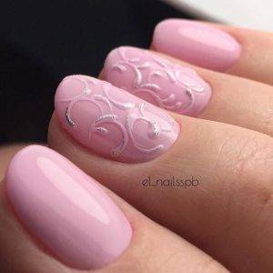 - пастельные тона. Практичный вариант маникюра и дизайна. Такие ногти будут носиться не одну неделю и подойдут к любому образу. Короткие овальные ногти в нюдовых оттенках с не ярким дизайном;