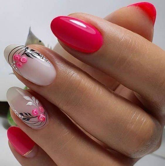 Цветочные мотивы создают изысканный, романтичный образ. Но поскольку этот дизайн довольно яркий, то его лучше использовать для одного-двух пальцев.