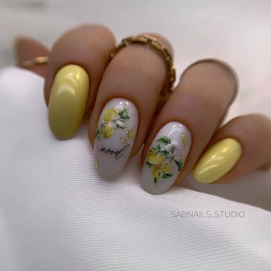 В тренде летний маникюр с клубникой, арбузом, малиной, ананасом, бананом, киви, авокадо и даже с изображением апельсина и лимона.