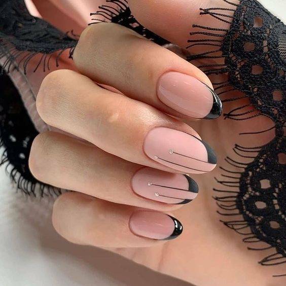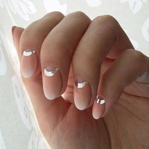 Чтобы «овал» выглядел также эффектно, следует обратить внимание на необычные решения улыбки, например, такие варианты дизайна, где контрастные линии обыгрывают в виде битого стекла, выложенного в мягкую линию, вдоль кончика ногтя