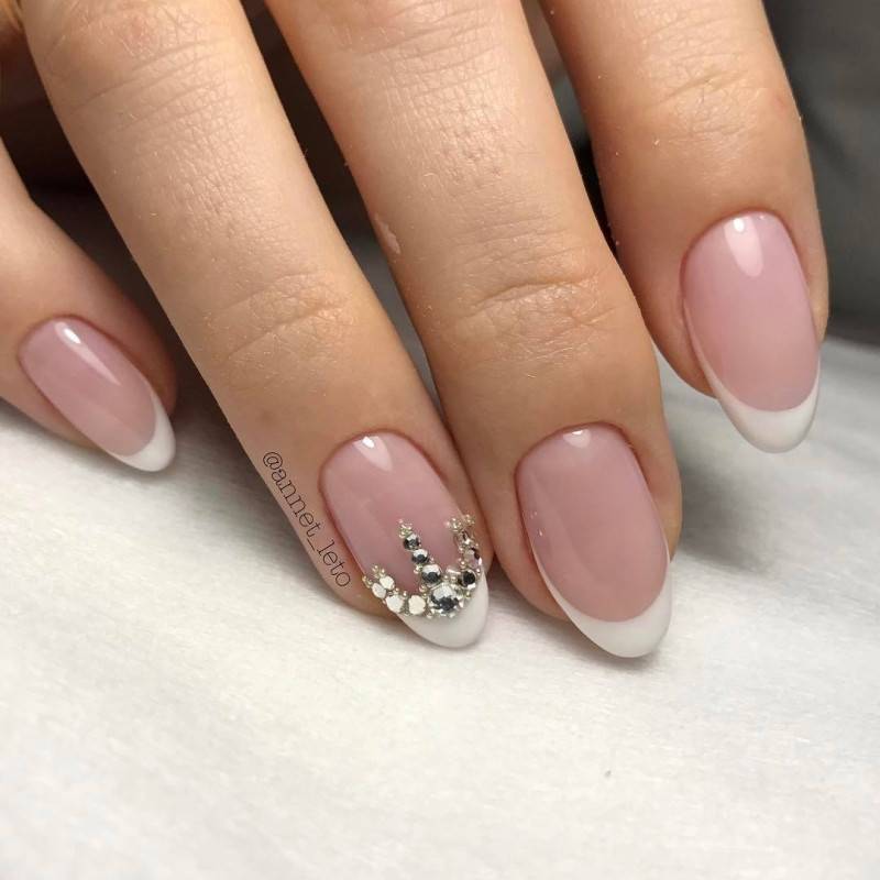 Французский маникюр на круглые ногти. Сегодня френч успешно адаптировался под любую форму и длину ногтей. Но в первоначальном варианте он максимально повторял натуральное строение ногтя. То есть пластинки имели среднюю длину, а белый кончик – округлую форму. Любители классики и по сей день придерживаются этих норм. Хотя цвет линии улыбки можно менять, украшать основу стразами и рисунками.