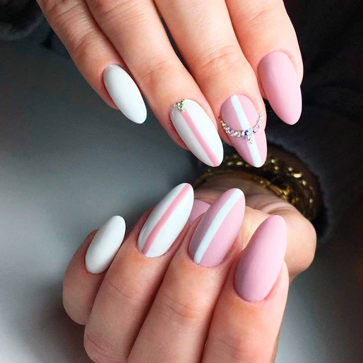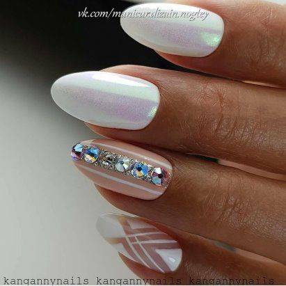 Практически вся пастельная гамма находится в распоряжении обладательниц овалов: нюдовый с черными и золотыми точками, мерцающий бежевый, нежные растяжки из шиммера, пудровые рисунки, тонкие полоски на опаловых тонах.