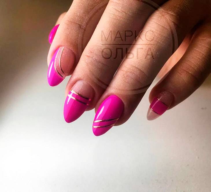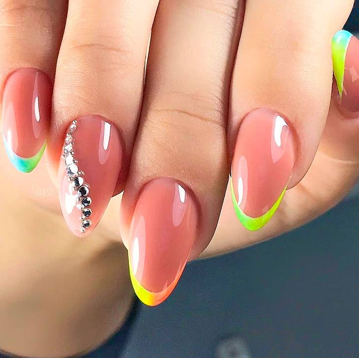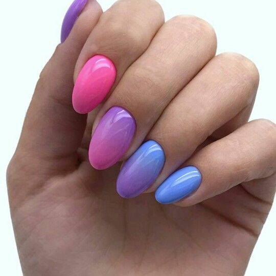 Любые, даже короткие овальные ноготки, могут быть очаровательны с сахаром в неоновых тонах, с вертикальным градиентом, малиновым, желтым и фиолетовым.