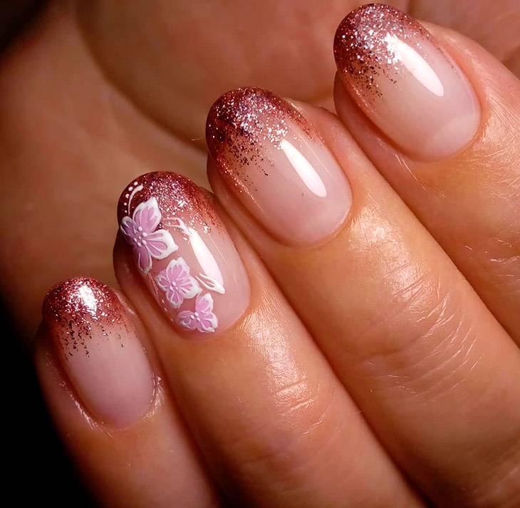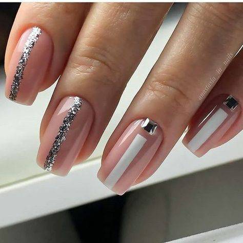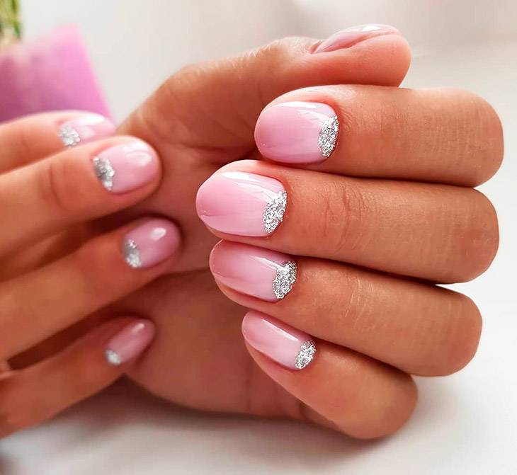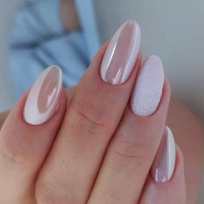 Новое в вариациях френча – это интересная симметричная геометрия на нюдовых прозрачных покрытиях с использованием глиттера, фантазийный свободный край с блестками в той же цветовой гамме.